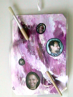 This painting-with-a-paintbrush represents the painting support group I’ve been going to. The paintings I’ve done there have tapped into my subconscious and helped me express my emotions concerning my cancer. The photographs you see on this object are the friends and family who have been there for me – and still are – during my ordeal with cancer.